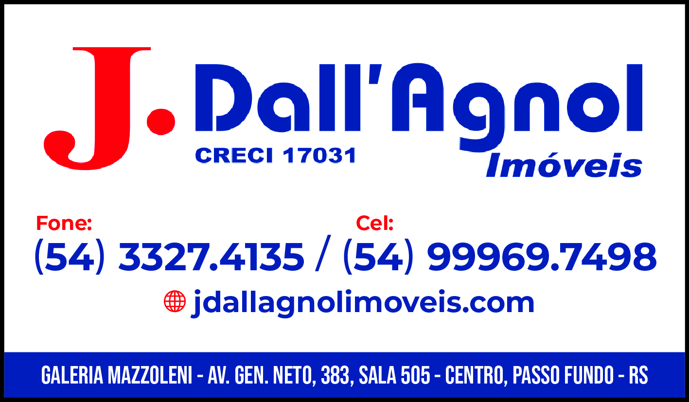 54 3327 4135 Traçar Rota jdallagnolimoveis.com Av. General Neto, 383 - Sala 505 - Galeria Mazzoleni - Centro - Passo Fundo - RS