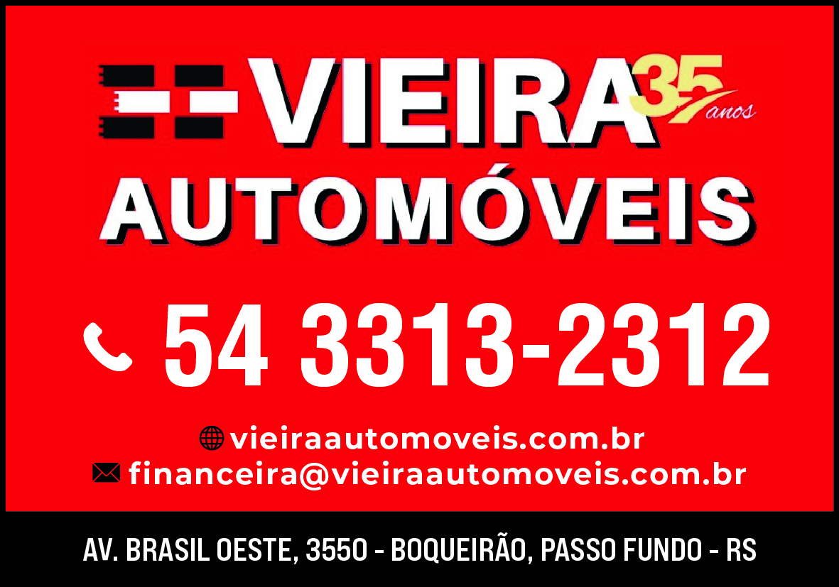 54 3313 2312 fiananceira@vieiraautomoves.com.br Traçar Rota vieiraautomovris.com.br Av. Brasil Oeste, 3550 - Boqueirão - Passo Fundo - RS